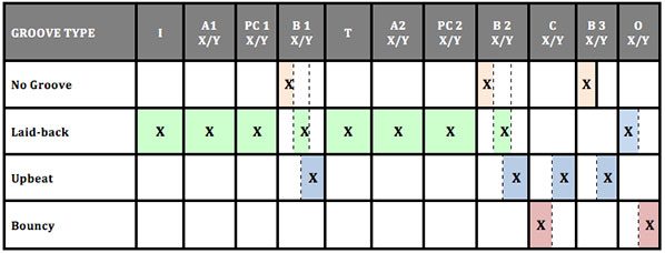 The impact of choruses one and two is heightened via an engaging groove build that traverses each full section. Each begins with no groove, moves into the laid-back groove, and peaks with the upbeat groove.