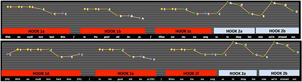The chorus features two infectious and memorable vocal hooks that are reinforced in both stanzas. The melodic characteristics of these hooks appear in a slightly differentiated manner throughout the section, which prevents cookie cutter monotony from occurring.